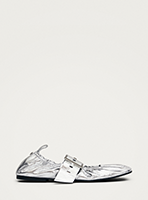 The Sarea ballet flats are crafted from shimmer silver leather with a vintage effect that molds naturally to the foot, offering a glove-like feel and effortless comfort. Designed with an elasticized edge that enhances flexibility, they sit on slim rubber soles for everyday wearability. The statement buckle—one of the hardware details introduced this season—adds structure and character to the silhouette, balancing its relaxed construction with a bold finish.