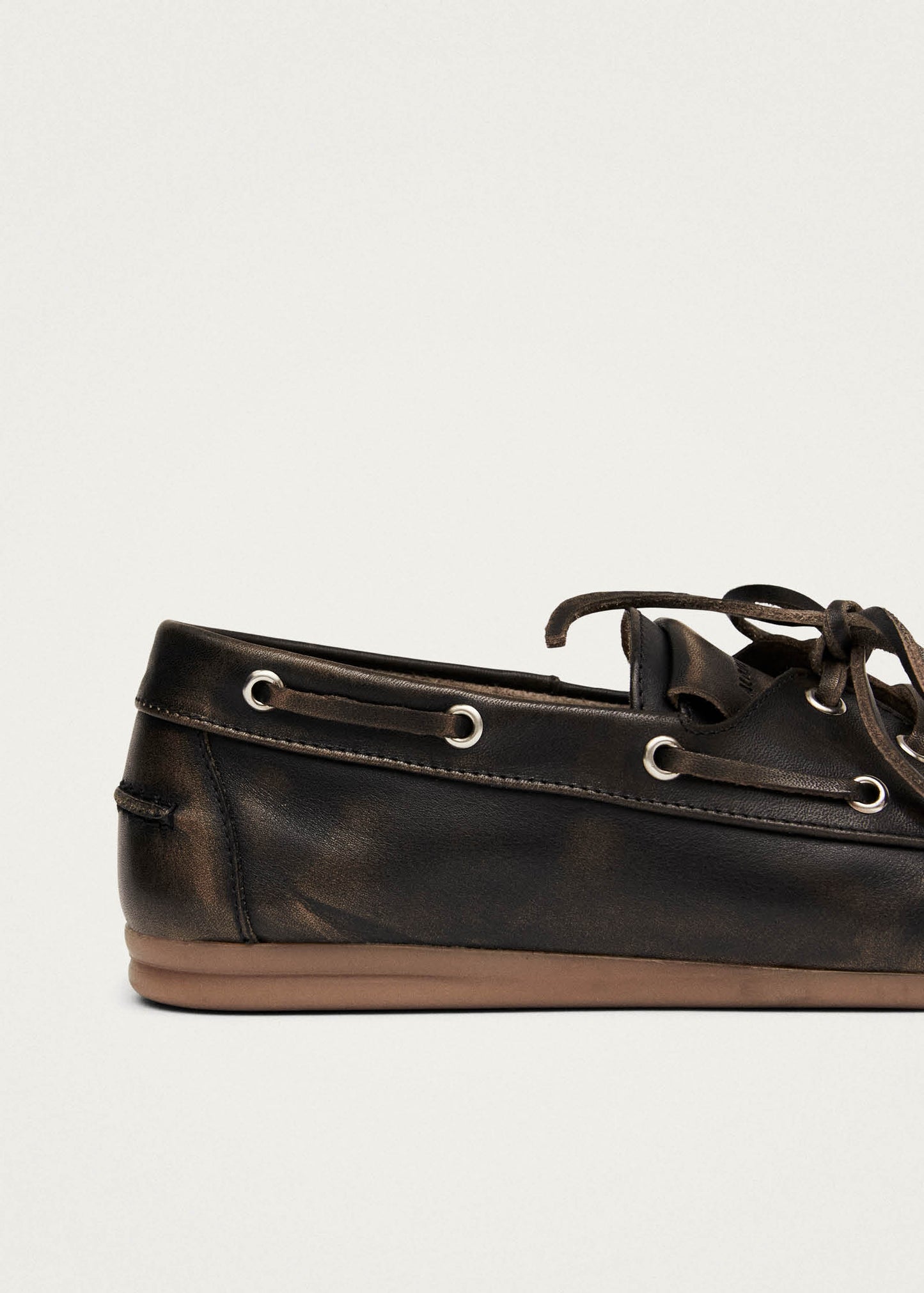 The Rowan loafers reinterpret the classic boat shoe with a refined twist. Crafted from brushed brown leather, they feature a textured finish and a moccasin-inspired construction. The lace-up front with metal eyelets and traditional collar lacing add a nautical touch, while the cushioned insole ensures comfort with every step. A timeless option for relaxed sophistication.
