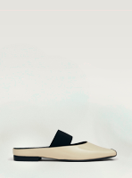 Las mules Mele son una silueta híbrida que fusiona detalles de bailarina con una construcción de mule. Elaboradas en charol color crema, cuentan con una punta cuadrada y la suela que se curva suavemente hacia arriba en la punta. La parte trasera abierta permite ponérselas con facilidad, mientras que el empeine está enmarcado por una amplia banda elástica que ofrece un ajuste seguro y flexible. El interior está forrado en un rico contraste negro, reforzando la sensación moderna y elegante de este par.