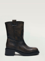 Las botas Rajan son la versión más corta de nuestras botas Sajan hasta la rodilla. Elaboradas en cuero marrón envejecido, que recrea un efecto vintage, comparten la misma silueta estructurada, punteras redondeadas y suelas de goma elevadas, pero con una caña ancha y baja que las hace ideales para llevar debajo de pantalones rectos o ajustados.