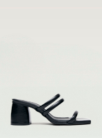 The Indiana are backless open-toe sandals defined by clean lines and a structured, balanced silhouette. Crafted in black leather with a subtle wrinkled effect, the design is set on a sturdy block heel and features slim straps that frame the foot with precision. Clean, graphic and quietly assertive in shape.